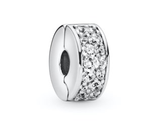 Our versatile pavé clip charm in sterling silver was first introduced in summer 2016 and remains as popular today as ever. It sits in a fixed position on bracelets, evenly spacing out other charms and helping to prevent them from sliding around.